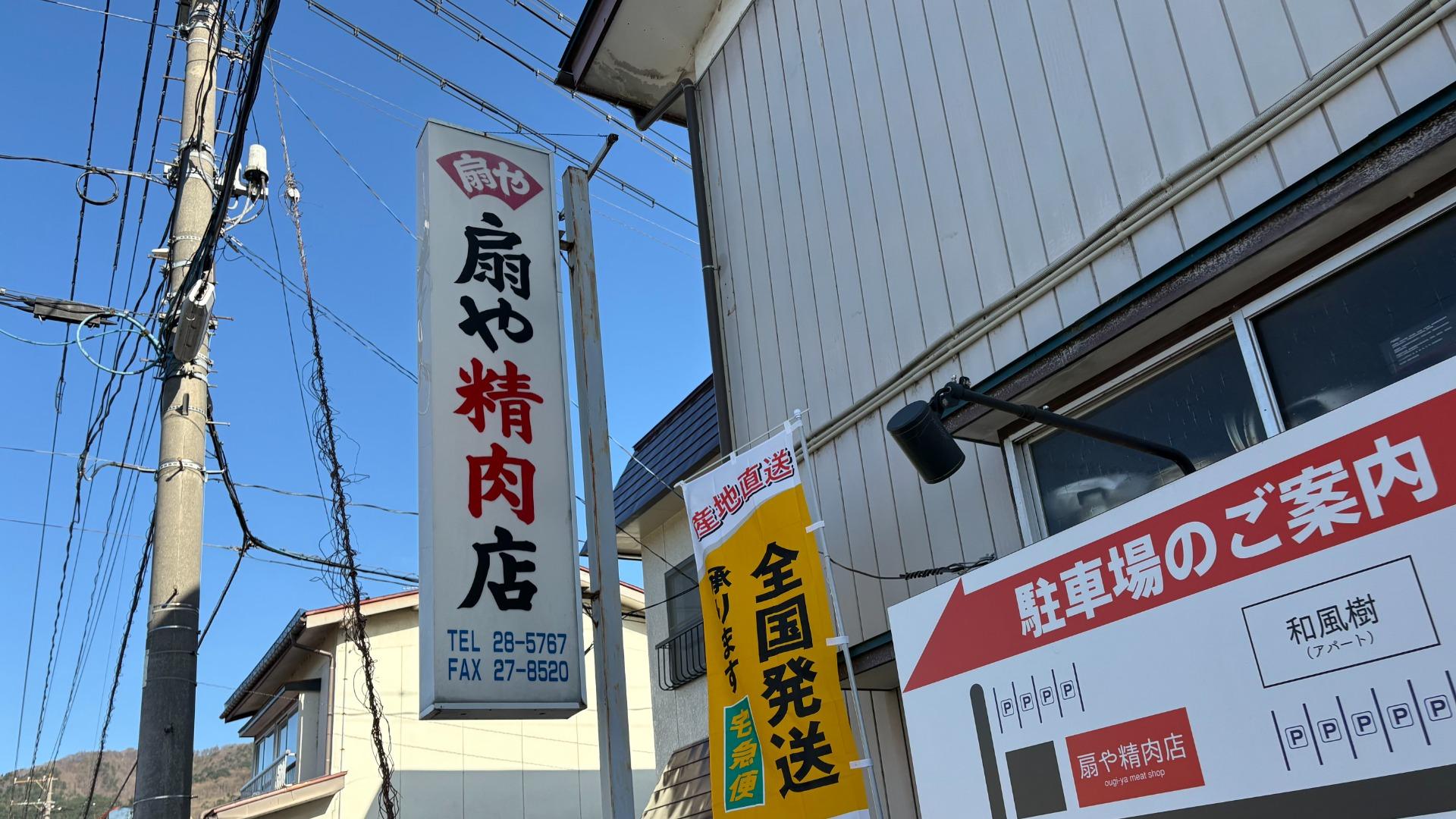 扇屋(扇子屋)ではなく精肉店。店名は「扇や精肉店」で「や」がひらがなです。会津の精肉店は「馬刺し」も扱います。