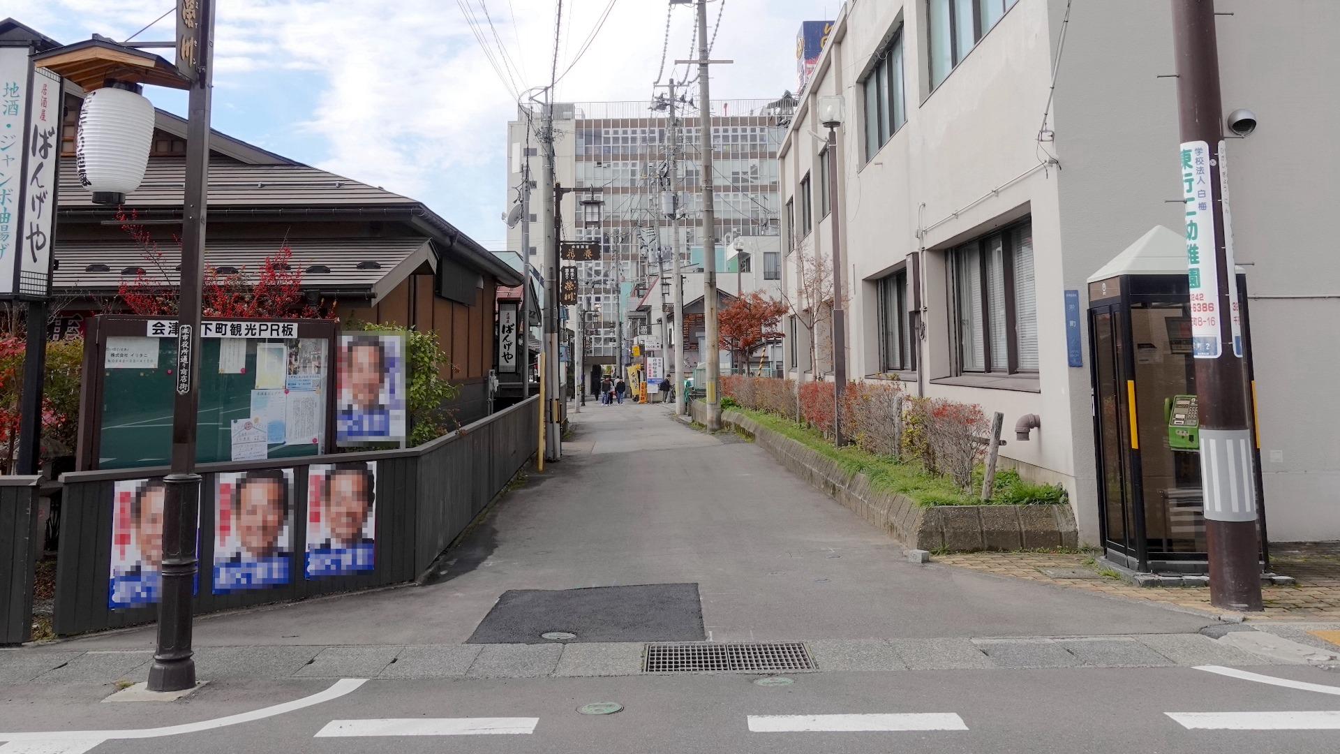 市役所(工事中)前から会津稽古堂へ向かう通りが市役所前通り。「花小路通り」は、市役所前通りを会津稽古堂へ向かい、最初の左折T字路を神明通りへ向かう小路です(一応、車も入れます)。