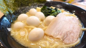 「麺の硬さ」「味の濃さ」「油の量」を選べます。今回は「味の濃さ」を「薄め」でお願い。他は「普通」で。うずらの卵はトッピングしました。もともと、うずらの卵はついていて、そこにトッピングの分が加わっています。うずらがてんこ盛りになりました。