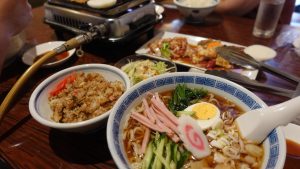 ランチセットメニューのラーメン+ミニチャーハンを「冷たいラーメン」に変更してもらいました。セットメニューにはサラダとお新香がつきます。
