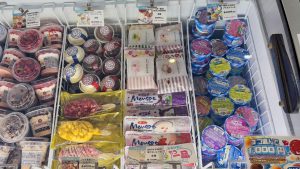 店内にはカテゴリー毎に冷凍庫が置かれています。入口を入ってすぐ左側に縦型の冷凍庫がありましたが、実は「ショートケーキ缶」なるものに興味を持っていたのですが、「売り切れ!」。もう、ショックで写真を撮り忘れました。(気弱すぎ)