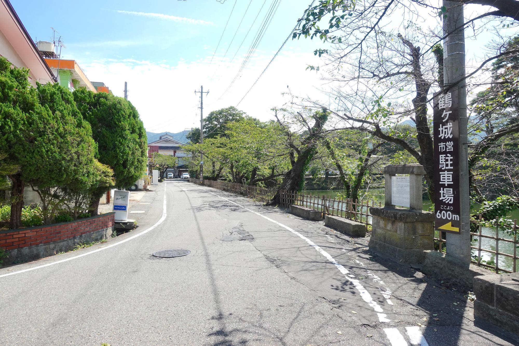 「鶴ヶ城市営駐車場」(西出丸駐車場)の案内。駐車場は600m先。