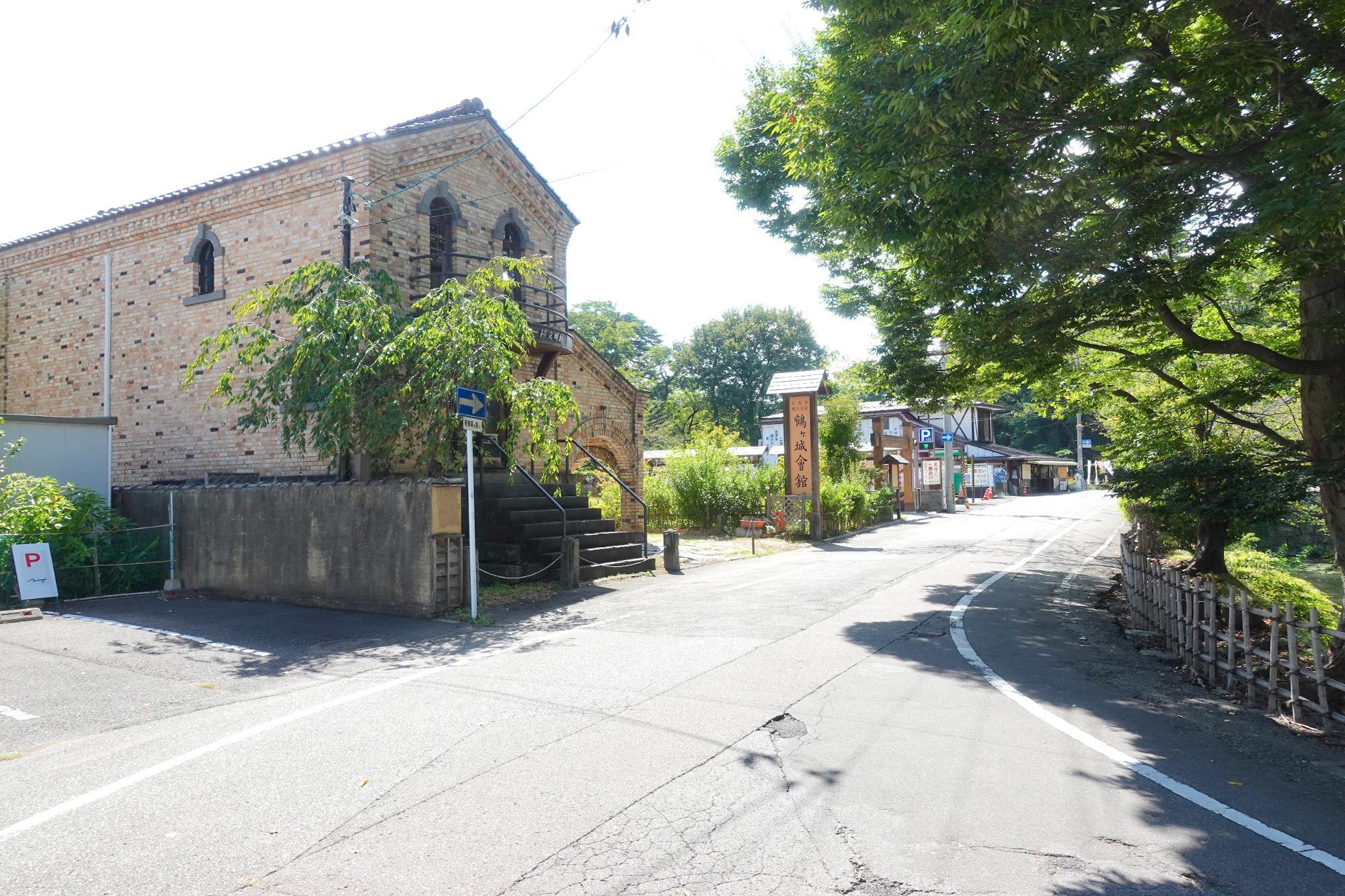 「鶴ヶ城会館」(通称、ツルカン)の駐車場に車を停めた場合、写真の門の所に連絡します。(鶴ヶ城会館への駐車場へはこの道からは入れません)