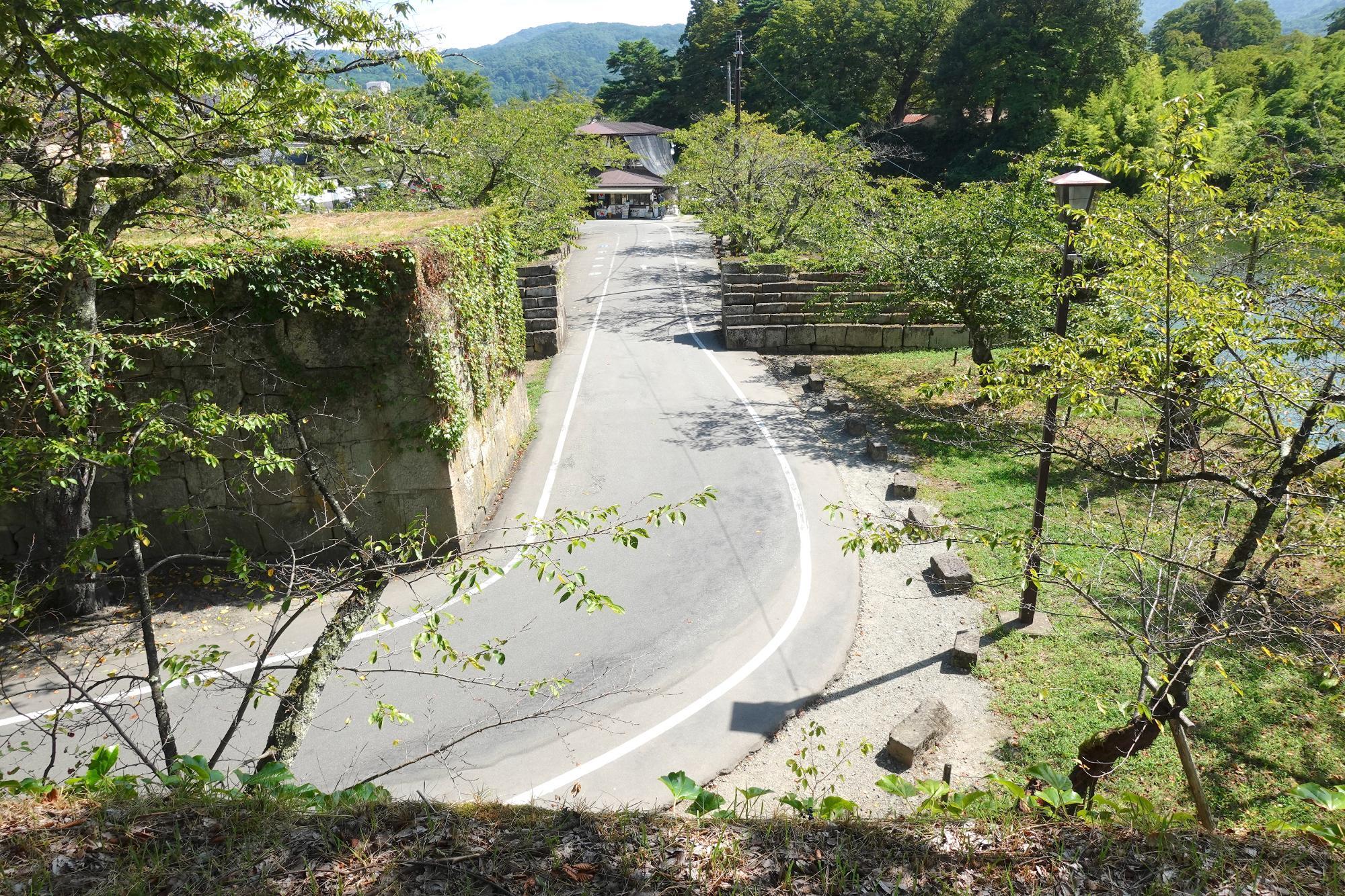 写真の手前の石垣は大腰掛(おおこしかけ)。雁木(がんぎ:階段状)になっていて伏兵を置いて迎えました。追手門は現存してません。