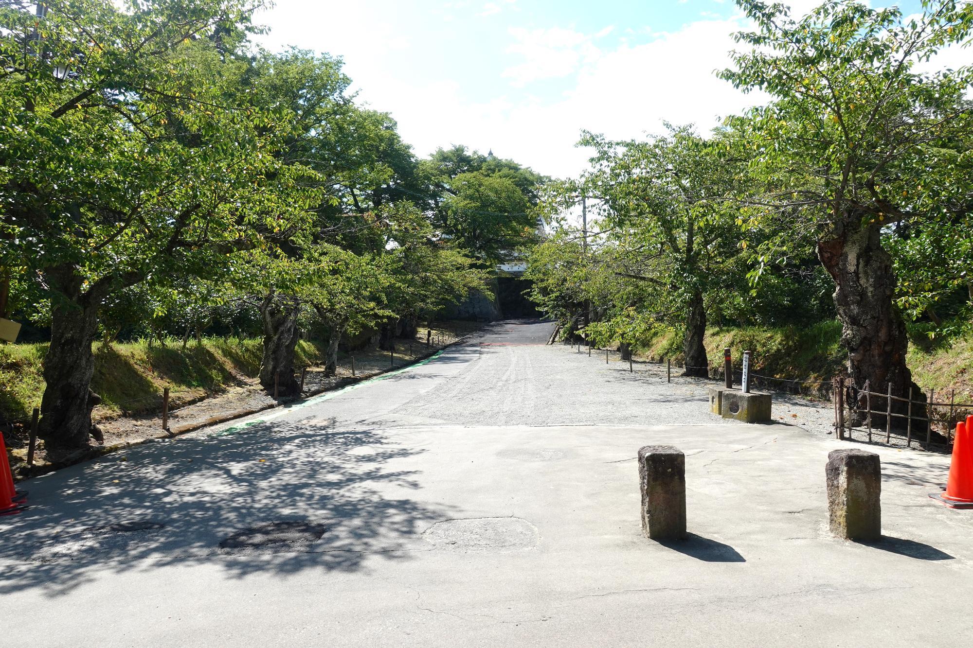 甲賀町通りから、大手口(正門跡)を見たところ。甲賀町通りから向かえば直進ですが、東西からだとつい通りすぎる事もあります。