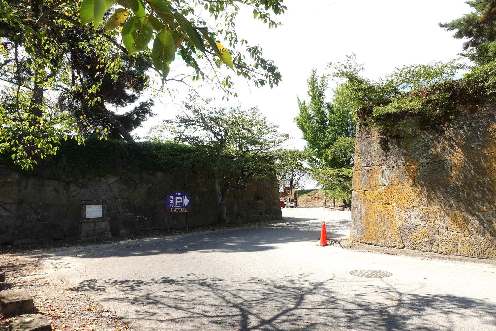 西出丸駐車場(有料)へ車で向かう場合、入口は北の「大手口」で一方通行になります。