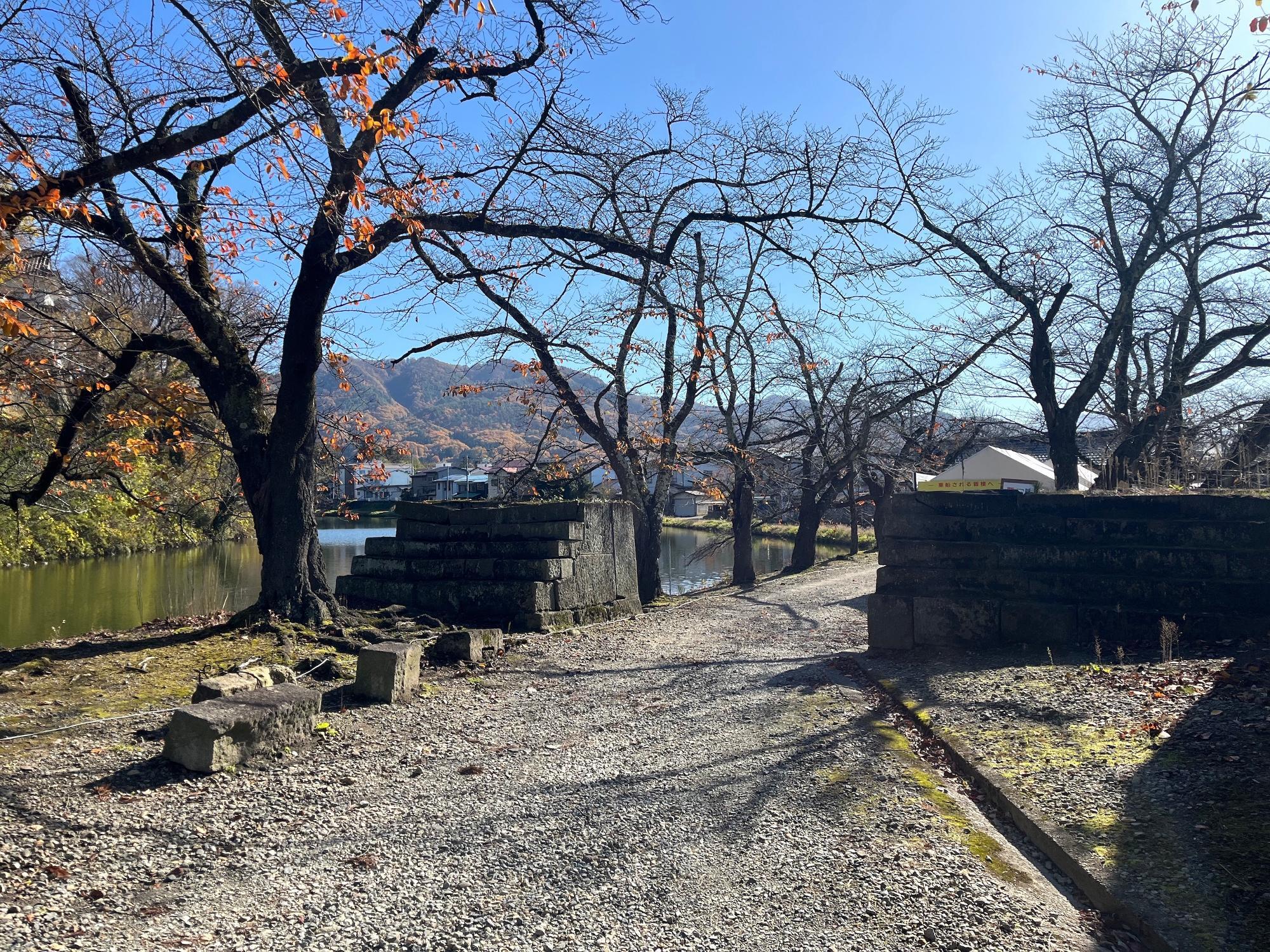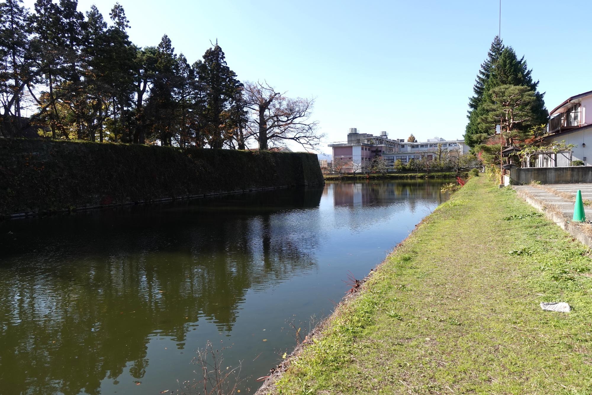 左の石垣が北出丸。正面の建物は、旧若松女子高校。今は、建物の一部が市役所として使われてます。(会津若松市役所は建て替え中)写真の通り、堀沿いを進みます。