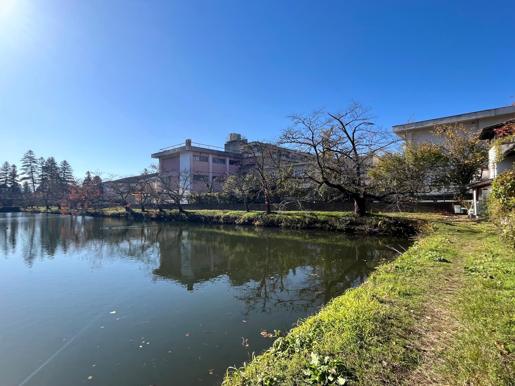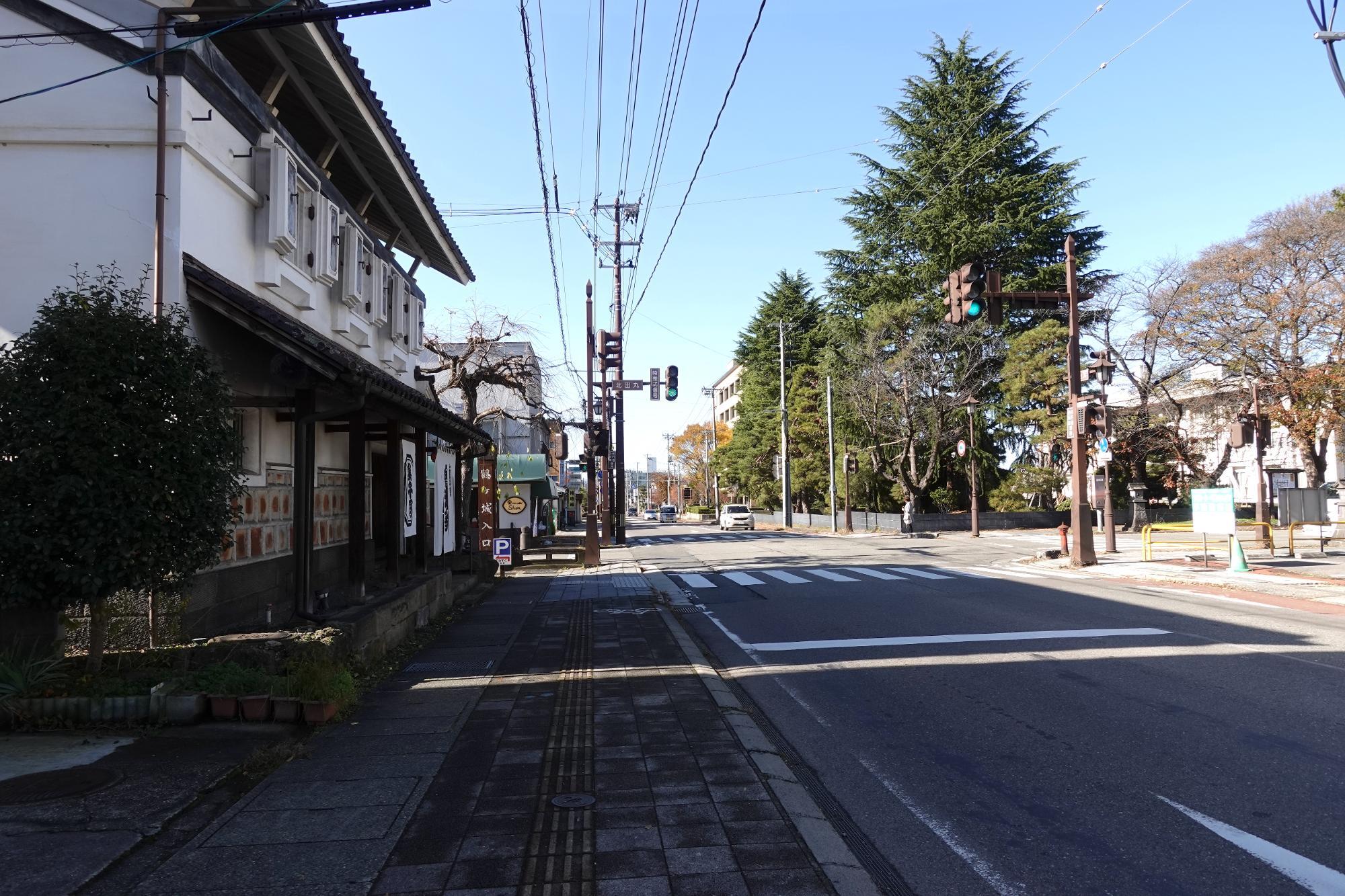 T字路の手前。お堀沿いを歩くことができます。「太郎庵」「鶴ヶ城会館」の南側。今回は、道路沿いを歩きます。