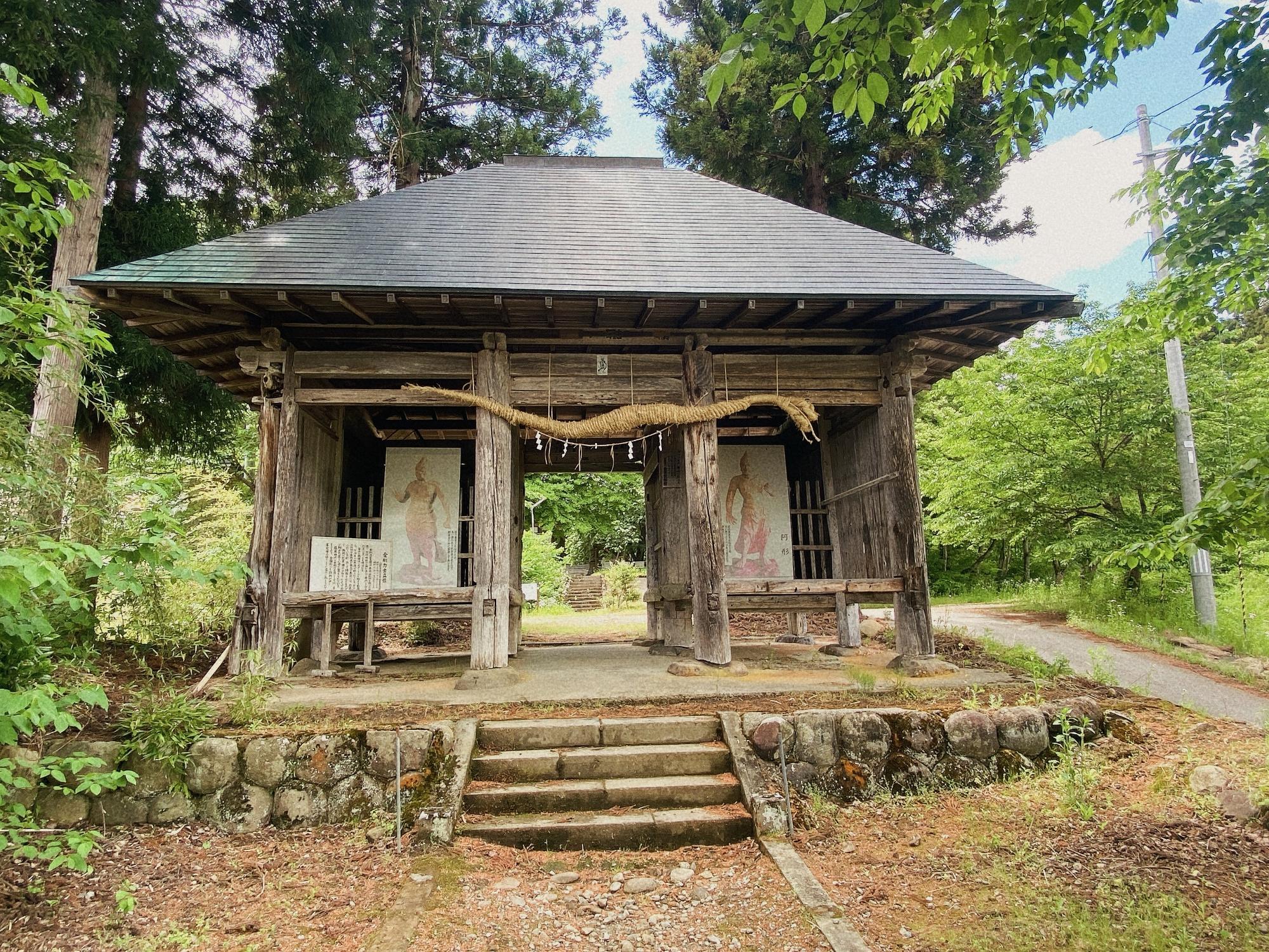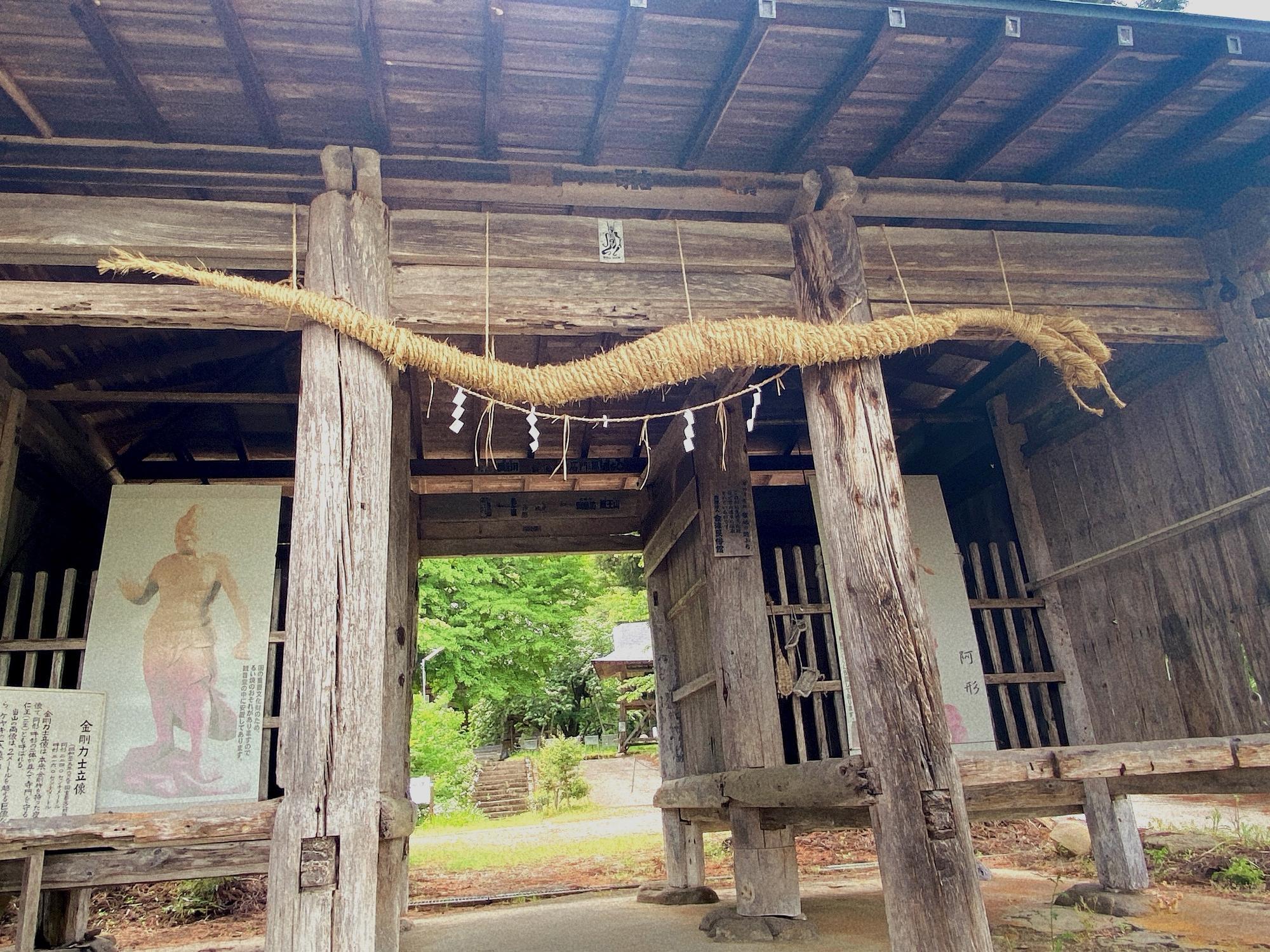 山門(仁王門)に掲げられているのは、藁で作られた蛇で、隔年毎に雌雄が変わります。毎年1月7日に蛇を下ろし子供達が集落の各家庭を周り、その間に大人達が新たに蛇を作って奉納します。