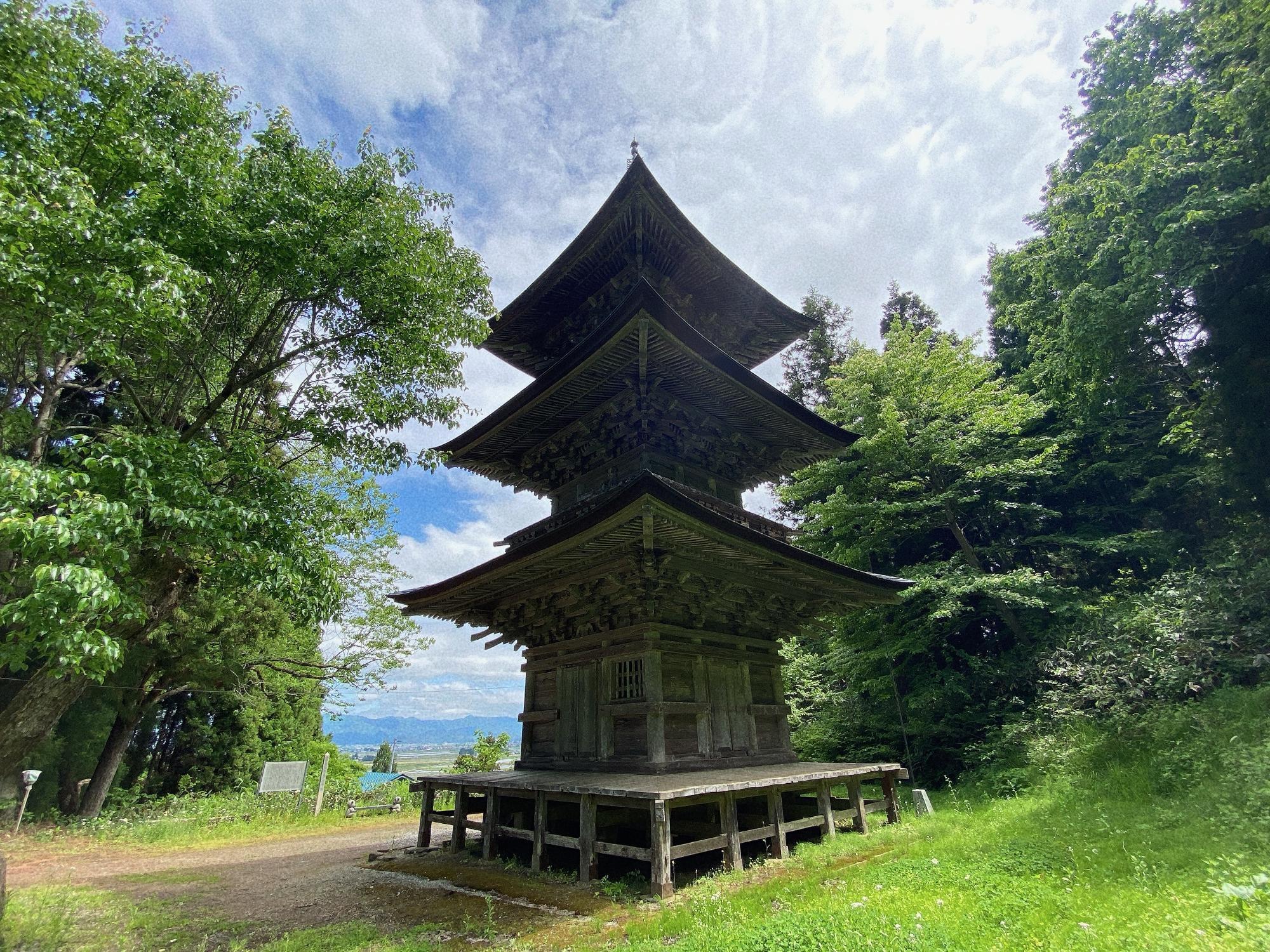 タイトルにある通り、会津に残る唯一の塔です。各屋根の大きさがあまり変わらず、美しい形をしています。伐採されているのでしょう、会津盆地(高田・本郷方面)が見えます。