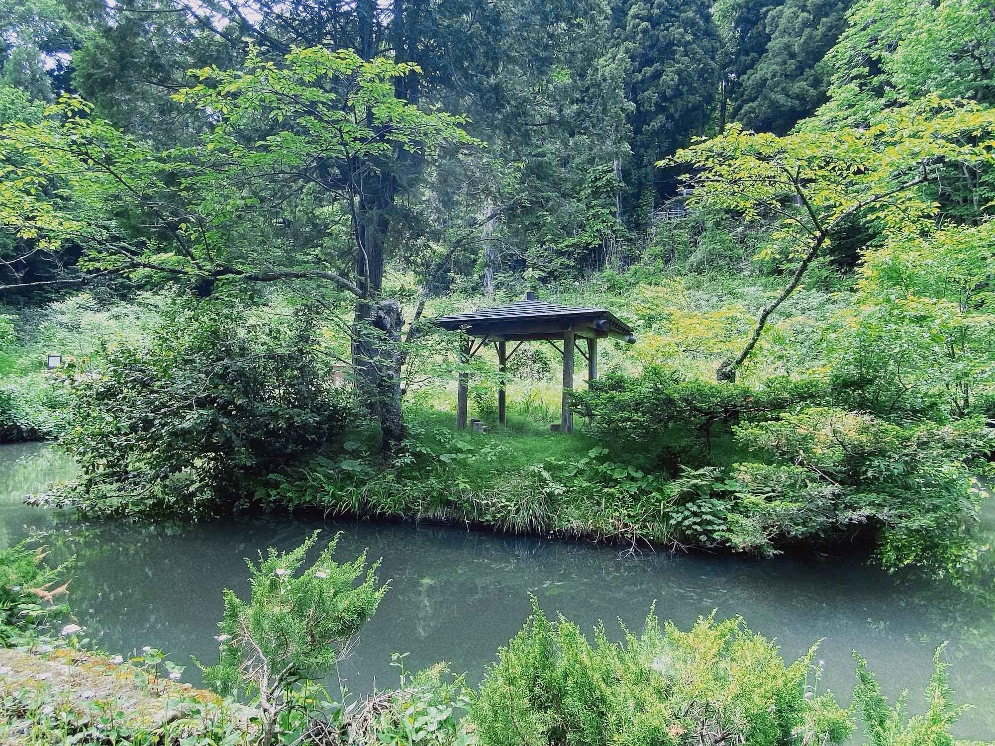 境内には池があり、浮島に東屋があります。浮島に渡る橋はないので見るだけ。東屋(あずまや)は、壁がなく柱だけの休憩所。粗末な家やひなびた家を指す言葉から使われるようになりました。(昔の、都からみた東方の人の家の蔑称から生じた言葉でした)