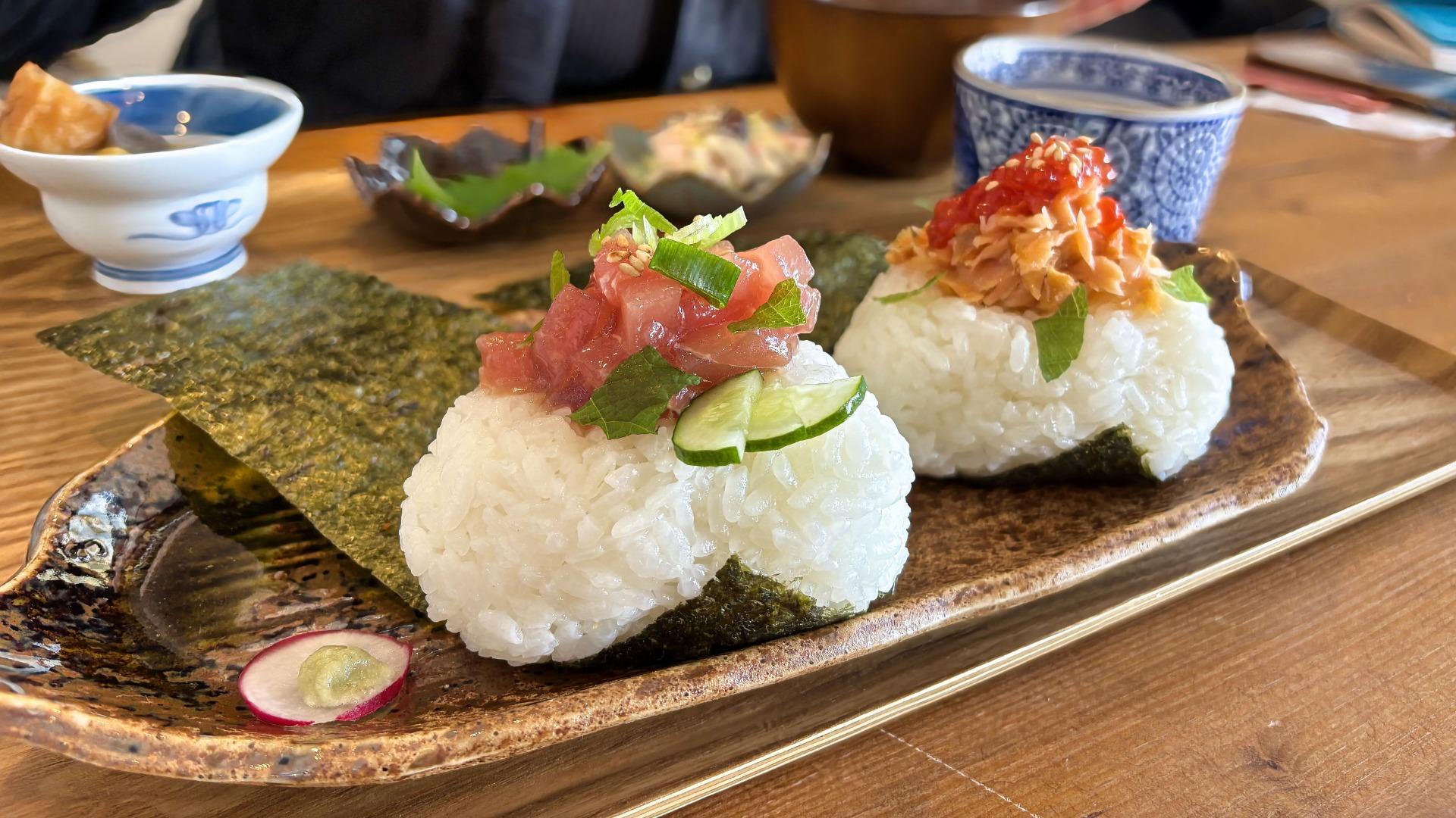 すばらかしい!。(素晴らしいの強調語、スラング)日本人でよかったね(おむすびの事です)。好きなおむすびを2つ選べます。「梅&ごま」「みそねぎ&チーたく」「焼鮭&すじこ」「おかか&塩昆布マヨ」「ベーコンマヨ」に加えて、別メニューから「漬けとろマグロ」。注文は、「焼鮭&すじこ」に「漬けとろマグロ」。ほうじ茶がつきます。この日の味噌汁は、「じゃがいもとなめこ」メニューに添付案内されていました。