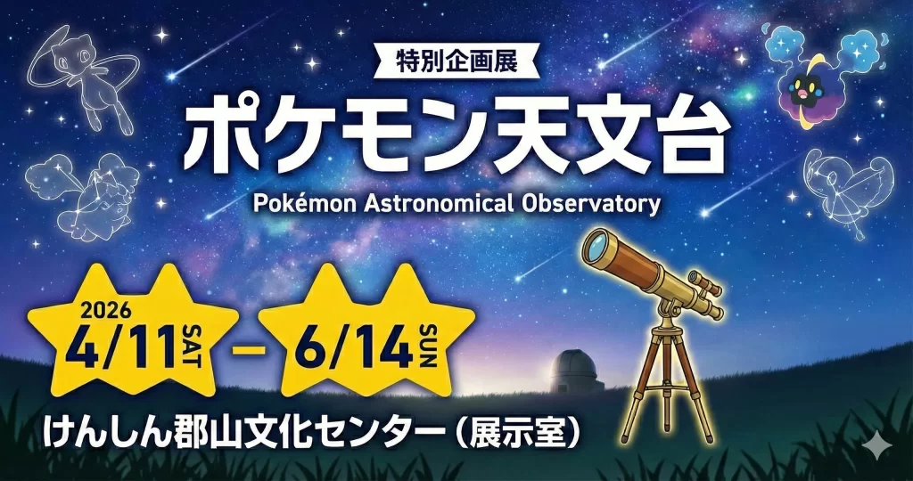 ポケモンと宇宙の不思議な関係に迫る特別企画展「ポケモン天文台」が、けんしん郡山文化センターで開催されます。広大な宇宙を旅するポケモンや星空を観察するピカチュウの姿を通して、宇宙への興味・関心を深めます。オリジナルグッズの販売や、国立天文... -