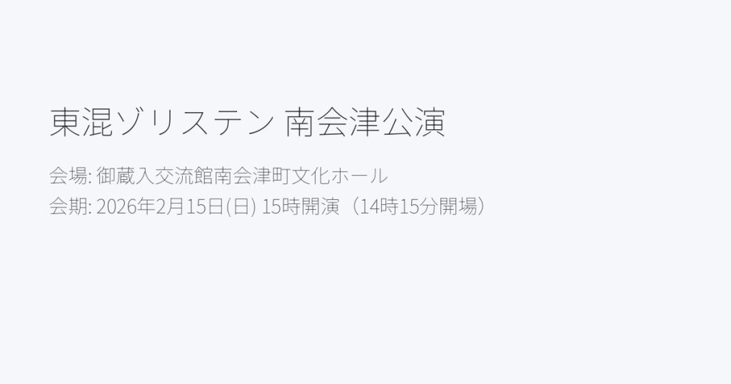 東混ゾリステンの南会津公演は2026年2月15日に御蔵入交流館南会津町文化ホールで開催される。ピアニスト鈴木槙崇と南会津合唱団が共演し、日本の抒情歌や多彩なプログラムを披露する。一般3,000円、高校生以下無料。