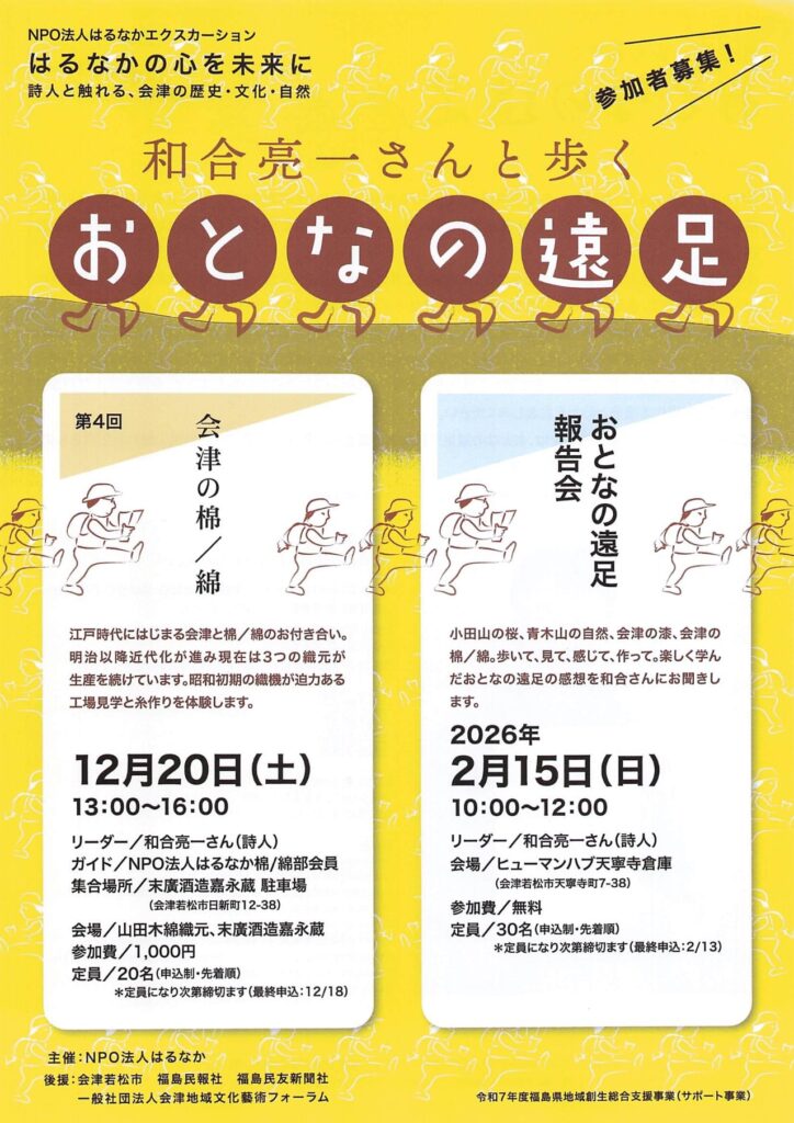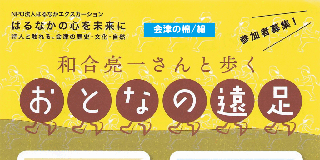 江戸時代に栄えた会津の綿産業をテーマに、詩人・和合亮一さんと歩く体験イベント。明治期に隆盛した綿工場を訪ね、「山田木綿織元」での昭和初期の織機見学や糸づくり体験を通じ、会津の歴史と文化に触れます。