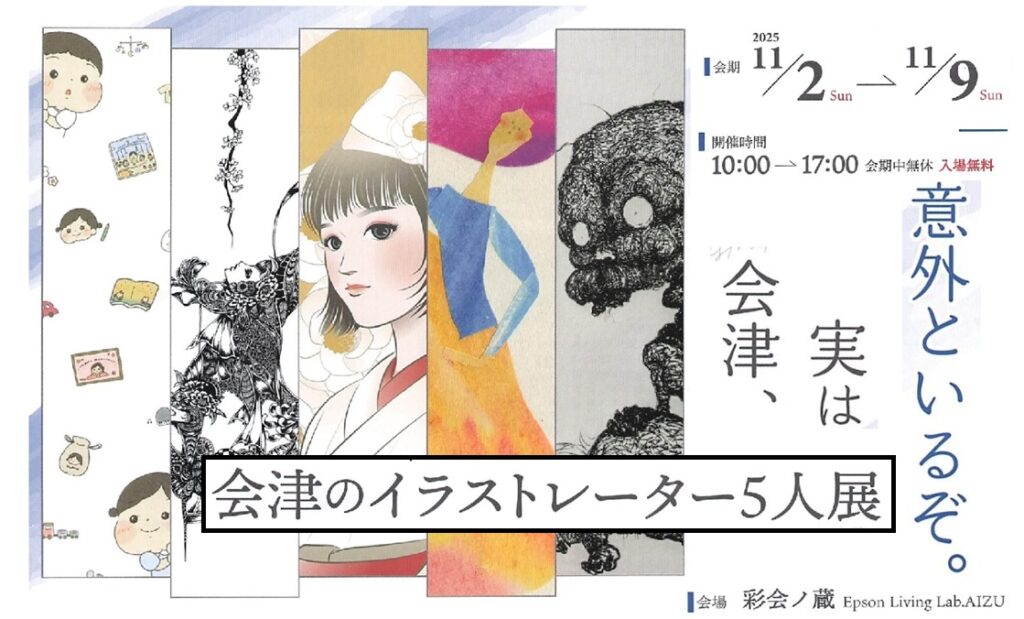 会津で活躍する5人のイラストレーターによる合同展。絵柄も世界観も異なる個性豊かな作品が一堂に会します。展示のほか、会場限定グッズの受注販売も実施。地元作家たちの多彩な表現を間近で楽しめる1週間です。