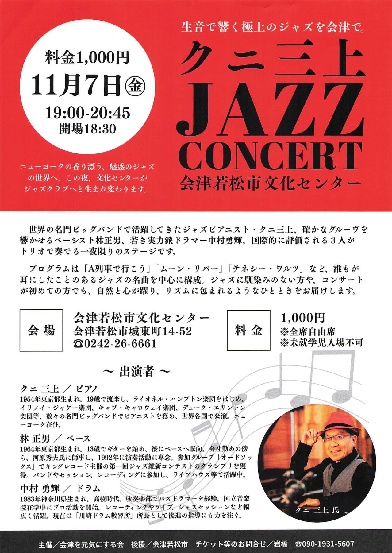 世界の名門ビッグバンドで活躍したジャズピアニスト・クニ三上による特別コンサート。ベーシスト林正男、ドラマー中村勇輝とともに、名曲「A列車で行こう」「ムーン・リバー」などを披露。心地よいグルーヴが響く一夜限りのジャズライブ。