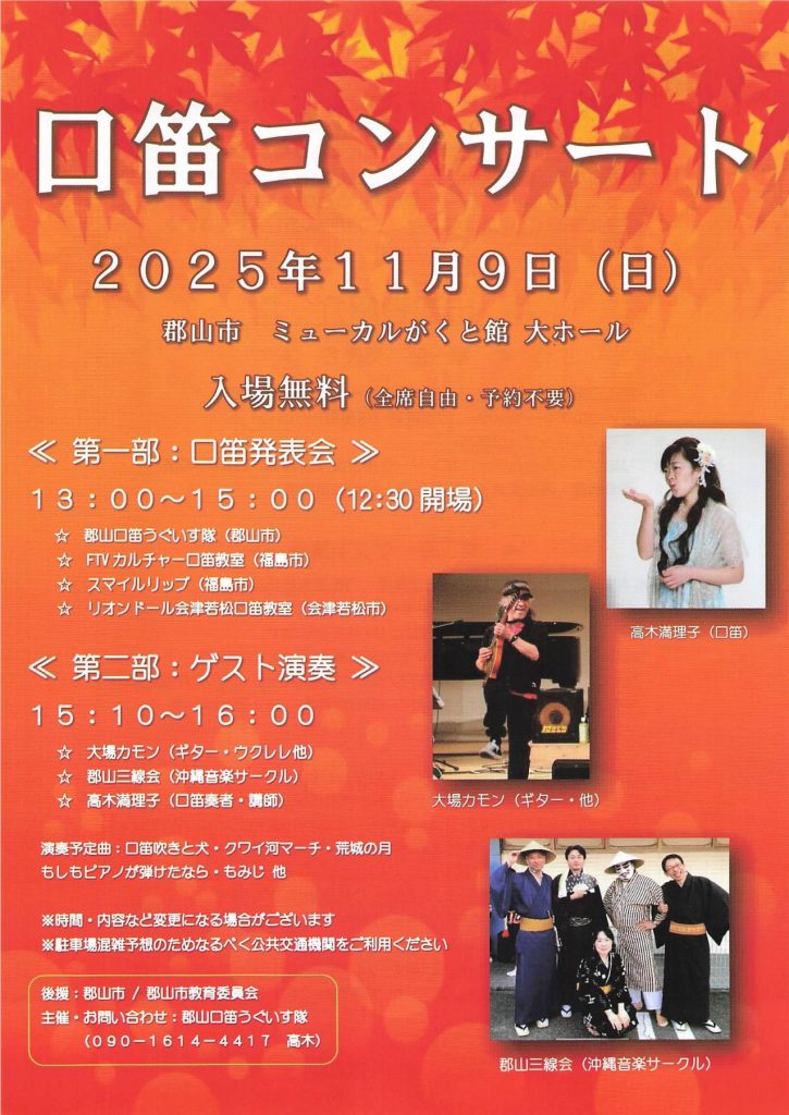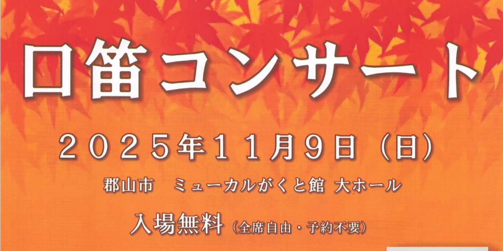 郡山市ミューカルがくと館大ホールで開催される入場無料の口笛コンサート。第一部では郡山口笛クラブなどによる発表会、第二部では高木満理子や大場カモンらのゲスト演奏が行われ、幅広いジャンルの音色が楽しめます。