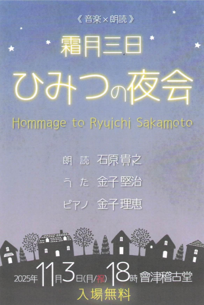 音楽と朗読が織りなす一夜。坂本龍一へのオマージュとして、声とピアノが紡ぐ静かな時間を届けます。朗読と歌、ピアノ演奏による心温まるアートパフォーマンス。入場無料の特別な夜会です。