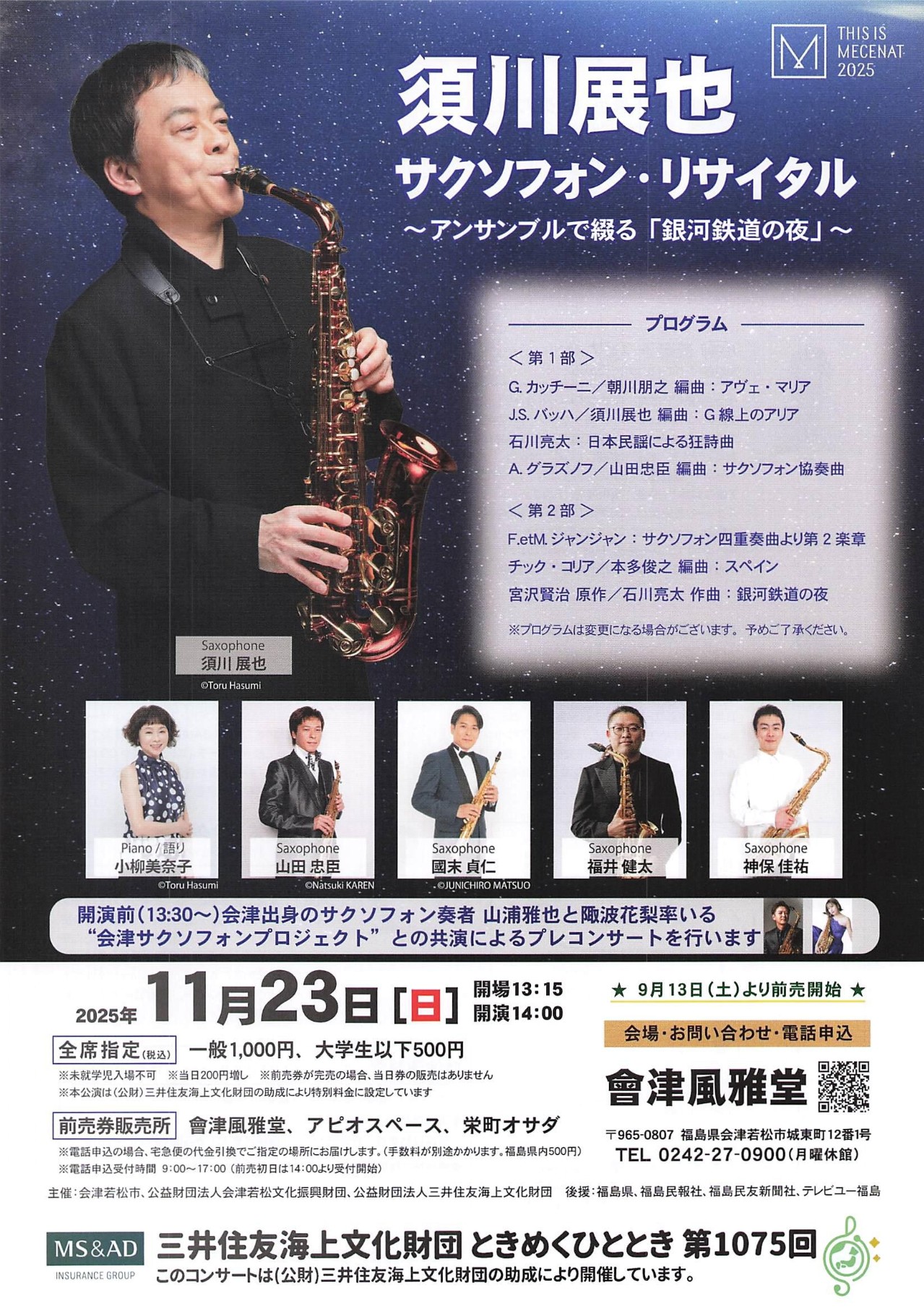 開演前(13:30~)会津出身のサクソフォン奏者 山浦雅也と陬波花梨率いる”会津サクソフォンプロジェクト”との共演によるプレコンサートを行います。