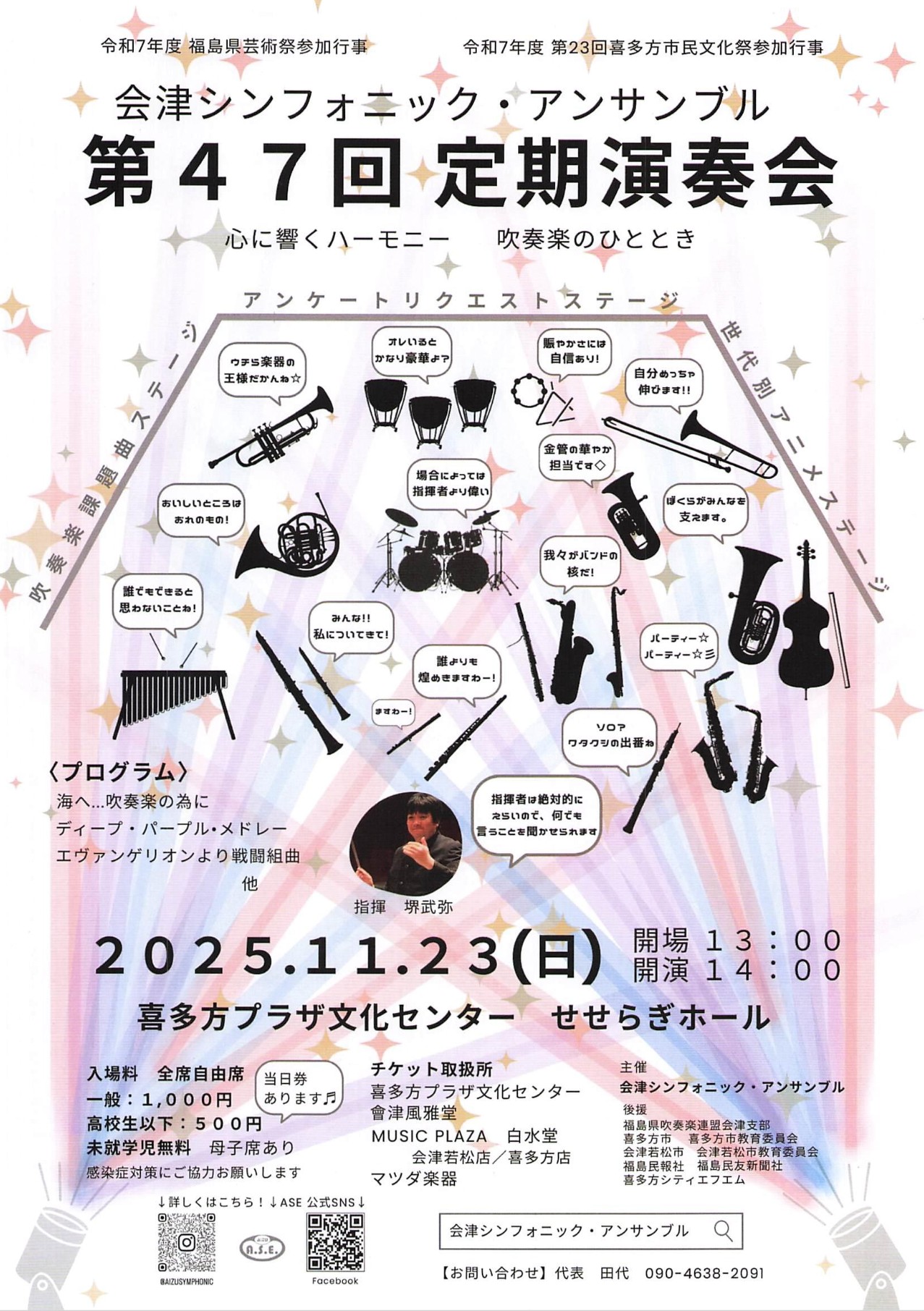 アンケートリクエスト曲や年代別アニメステージなど、世代を超えて楽しめる吹奏楽コンサート。ディープ・パープルメドレーやエヴァンゲリオン戦闘組曲など多彩なプログラムで、心に響くハーモニーを届けます。