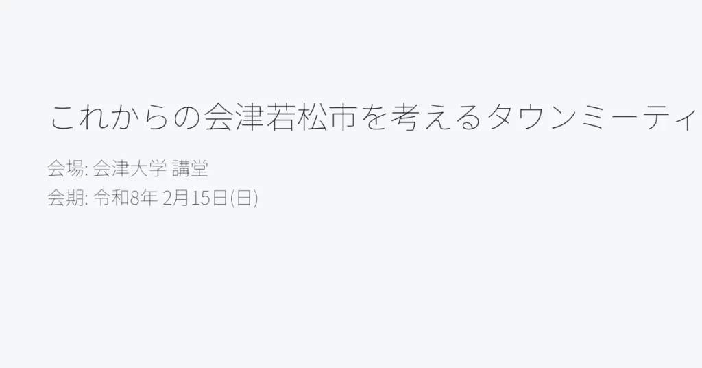 会津若松市の将来を考えるタウンミーティング。人口減少に関する講演やワークショップの成果発表を行います。講師はニッセイ基礎研究所の天野馨南子氏。オンライン視聴や手話通訳、託児サービス(要予約)も利用可能です。参加無料、先着200名(事前申込制)。