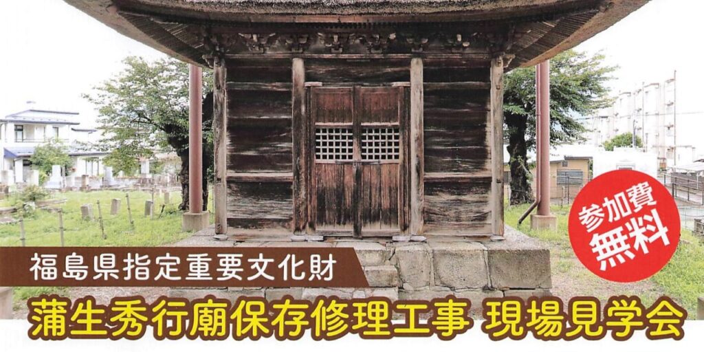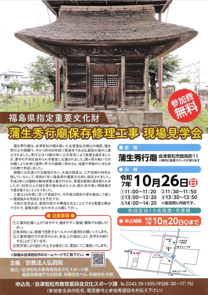 福島県指定重要文化財「蒲生秀行廟」で行われている保存修理工事の現場を公開。会津の礎を築いた蒲生氏郷の嫡男、蒲生秀行の霊廟の修理過程を専門家の案内で見学できる貴重な機会。参加無料・事前申込制(先着順)。
