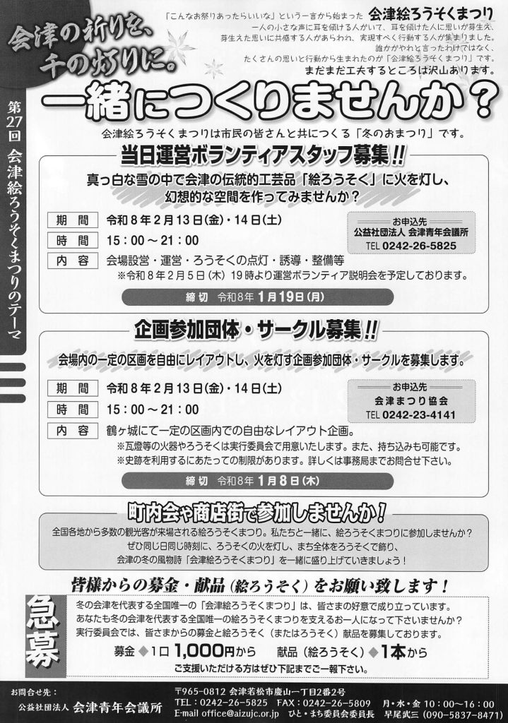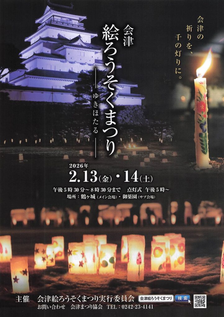 会津の祈りを千の灯りに込めて行われる夜のイベント。2026年2月13日・14日の2日間、鶴ヶ城をメイン会場、御薬園をサブ会場として、午後5時30分から8時30分まで開催され、午後5時から点灯式が行われる。会津伝統の絵ろうそくや灯籠が雪の中に並び、幻想的な雰囲気を楽しめる祭り。