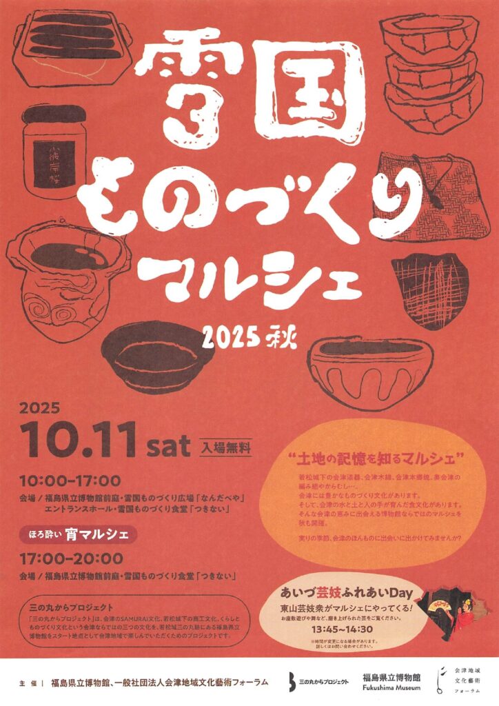 2025年10月11日(土)10:00~17:00、福島県立博物館前で開催。会津のものづくり体験や工芸品販売、会津のおいしいものが集結。17:00~20:00は会津の地酒と料理を楽しむ「ほろ酔い宵マルシェ」も同時開催。入場無料。