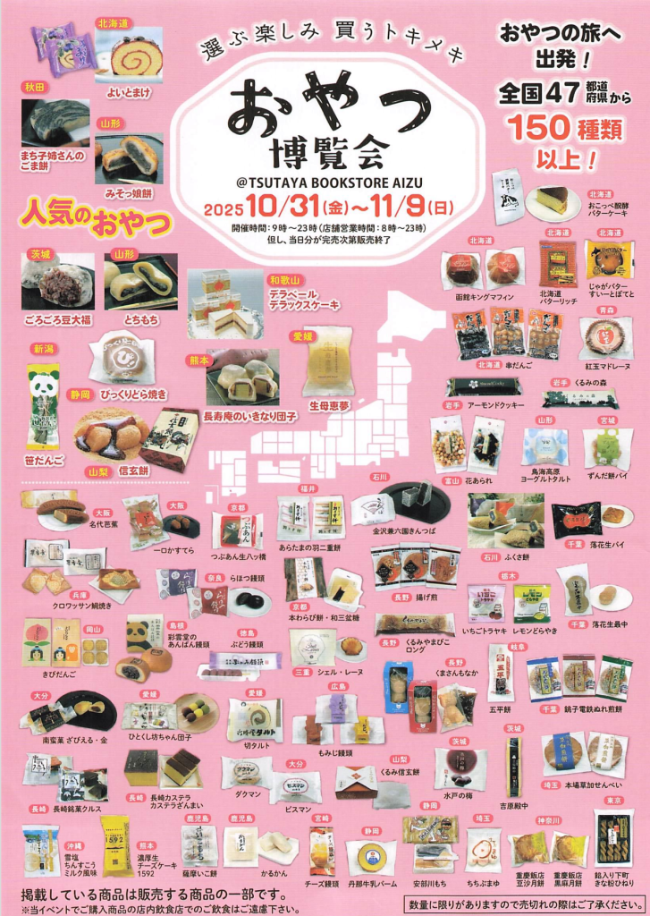 全国47都道府県から150種類以上のおやつが集まる「おやつ博覧会」。定番からご当地限定まで、選ぶ楽しさと買うワクワクが詰まった人気イベント。和洋問わず幅広いスイーツがTSUTAYA会津に大集合。