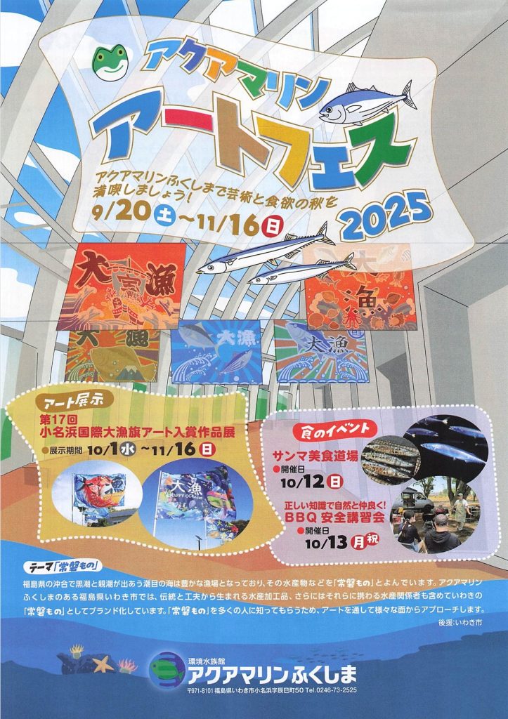 アクアマリンふくしまを彩る秋のアートと食の祭典。大漁旗アート作品展やサンマ美食イベントなど、芸術と味覚を楽しめる企画が盛りだくさん。海と人、自然とのつながりを感じる体験型イベントです。