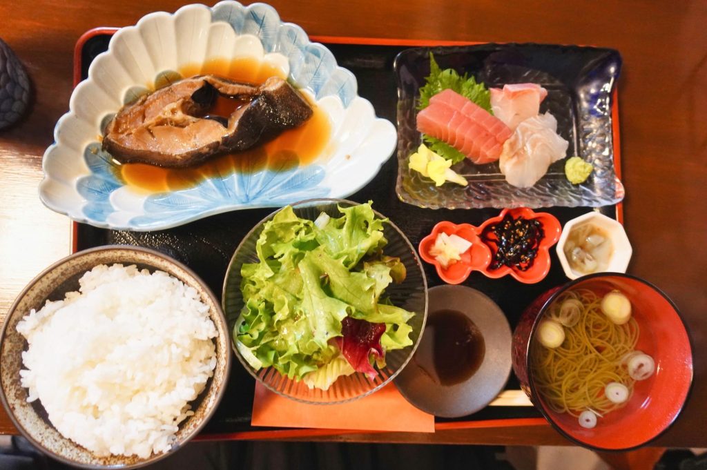 有頂天 本日の煮魚(カラスがれい)とお造り3点盛り定食